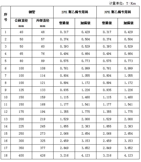 鋼質(zhì)管道聚乙烯防腐層材料用量表